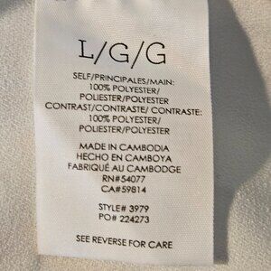 Special features: Pullover with V-neck ruffled neckline. Material is kind of sheer, dark undergarments would show through. Crepe textured feel. Lightweight.