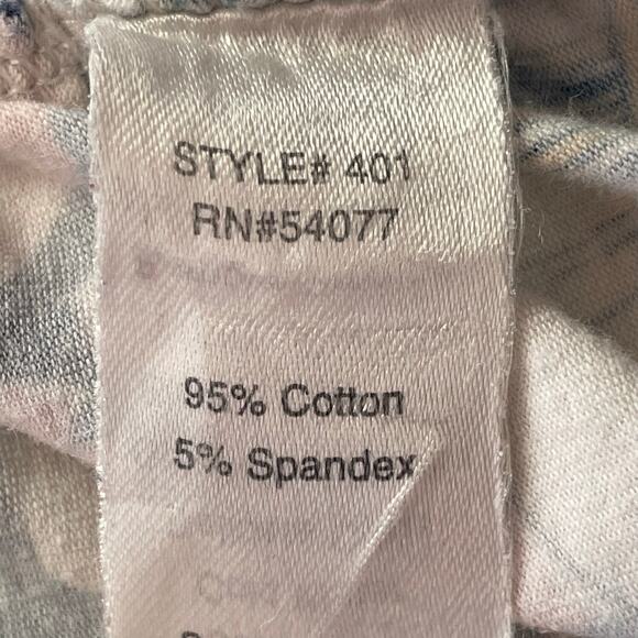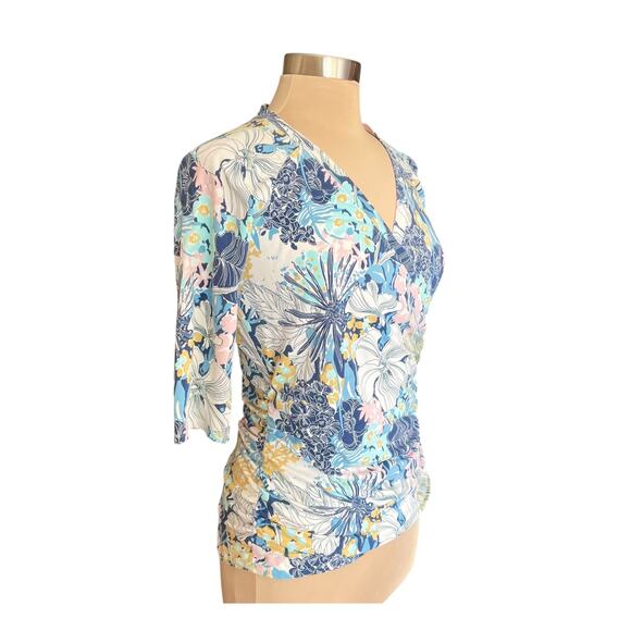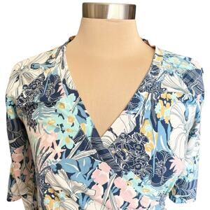 Cabi Style 401 Blue Floral Faux Wrap Top Ruched Sides V-neck Size LARGE 3/4 Sleeve Spring Summer. Floral pattern in blue, pink, and yellow. 95% cotton, 5% spandex.
