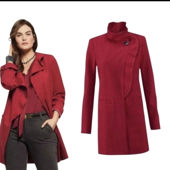 This buttery sleek ponte makes this gorgeous statement coat oh-so-comfortable. The mini-houndstooth print contrasts two different reds, which blend together for a dimentional look. The collar and asymmetrical overlay are edged in a ruffle, and it can be closed with the tortoise button at the chest. This jacket/coat has welt pockets at the hip, a nice long length, single buttons at the cuff, and an