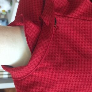 This CAbi Celebration Jacket is a stunning addition to any wardrobe. The gorgeous red color and houndstooth design make it a classic piece for any occasion. The jacket is made of a sleek ponte fabric with a touch of spandex for comfort. It features a classic fit with a knee-length coat and long sleeves. The jacket has two buttons at the top for closure and front pockets for added convenience. The coat is made of rayon/nylon/spandex and the jacket/coat is machine washable for easy care. This jacket is perfect for winter, fall, or spring and is available in size S.