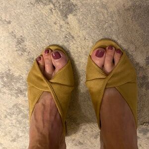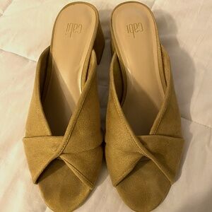 Extremely stylish and comfy mules. Color is like a chameleon. It appears at times a sage green or muted tan/gold, depending on the light. Very well made shoe. Sold with original box.