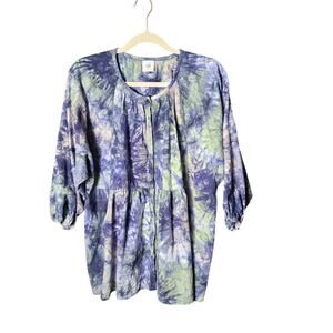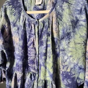 Cabi Sz L Tie Dye Woodstock Linen Blend Babydoll Tunic Boho Top Hidden Button Up