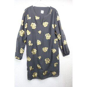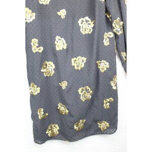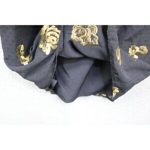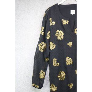 This is a Cabi "The Occasion Dress" that is a size Small. It is black with gold embroidery. It is also swiss dot. It has long sheer balloon sleeves. It is 100% Polyester. Laying flat, it measures: Armpit to armpit-19.5" and the Length is 37". Very Whimsigoth and trendy. In great condition.