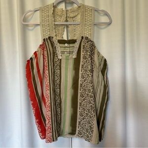 Cabi Top #266 Sleeveless Crocheted Boho Floral Green Orange Striped Gauzy Size M