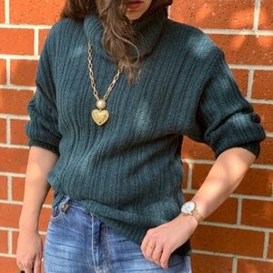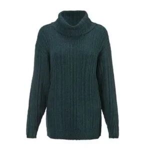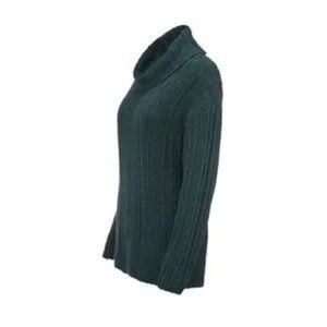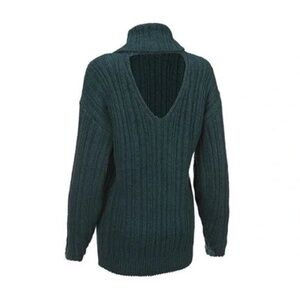 What a great sweater - I like to call it a twofer. You can wear it 2 ways - front or back! This is the comfy oversized sweater you throw on and be very cozy The best thing is that you can wear it 2 ways. Because it is oversized you might want to downsize a size…just depends on how bulky you like your sweaters Teal Shadow color. Relaxed fit. Dropped armholes. Variegated rib pattern. Turtleneck. Hits at the hips. Open V-shaped cutout in back. Brushed, heavy sweater knit. 55% Cotton, 33% Acrylic, 10% Polyester, 1% Spandex, 1% other fibers.