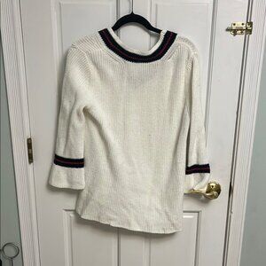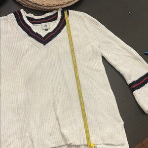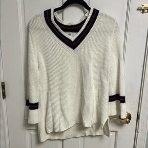 Stay cozy and stylish with this chic white sweater. Featuring a classic V-neck and eye-catching striped accents, it's perfect for any occasion.