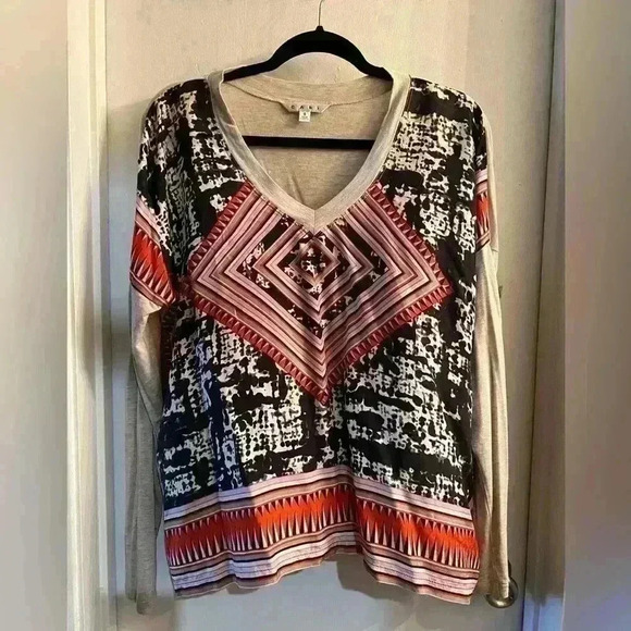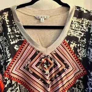 Cabi Womens Top Size S Oversized Red Beige Geometric Flowy Silk Blouse Top