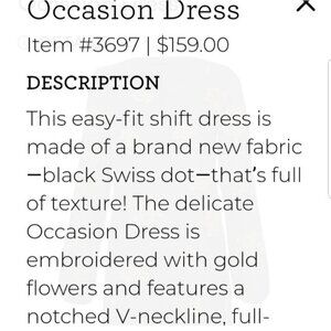 Elegant shift dress in black with a Swiss dot pattern and gold foil accents. Perfect for special occasions, this dress offers a flattering silhouette. Style #3697 in size S, made by Cabi.