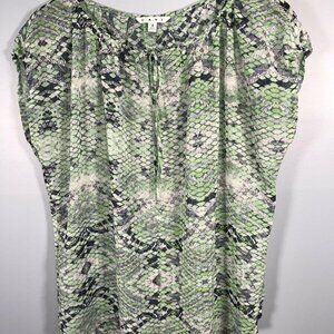 This Cabi blouse features a stylish snake print design in vibrant green, offering an elegant yet modern look. The lightweight fabric and tie neckline provide both comfort and a flattering fit, making it a versatile addition to any wardrobe.