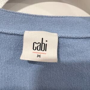 All orders ship within 1-3 business days. This women's long sleeve cropped cardigan sweater is made by Cabi. The back features a cutout. The color is a light blue. The fabric is cotton and nylon. Size is medium. Great condition. Make me an offer!