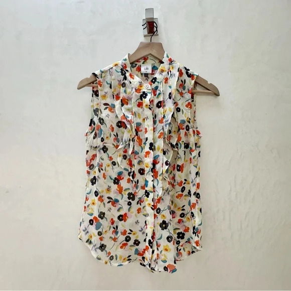 Cabi || Women's Sleeveless Ruffled Bodice in Vivivd Floral White Blouse XS