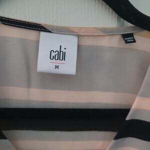 Cabi Underline striped sleeveless top. Top has tan, pink, blue, gray, and black stripes. Features a V-neckline.