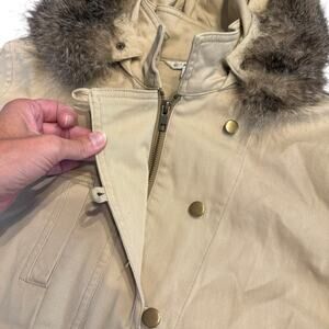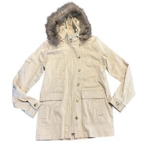 Cabi Women’s tan Nanook faux fur trim hooded jacket, S