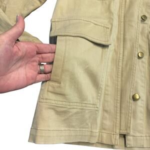 Cabi Women’s tan Nanook faux fur trim hooded jacket, stretchy chino material , zipper and button closure, pockets, fur trim is removable