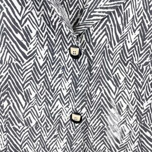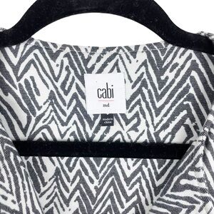 CAbi Zig Zag Ponte Knit Jacket. Features allover charcoal gray and white zig zag pattern. Features three fun buttons down the front. 3/4 length sleeves. Front side slit pockets. Beautiful seaming. Style 3034. Stretch 67% cotton 29% nylon 4% spandex.