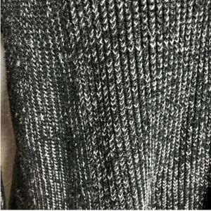 Cabi black gray long open front cloak cardigan. Open front long line cardigan. Chunky marled knit. Contrasting knit pattern on bottom. Size Medium. Excellent preowned condition. Minor wash wear. #3530.