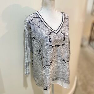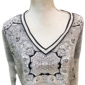 Cabi black & white mixed print v neck silk/viscose top high low hem 3/4 sleeve