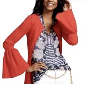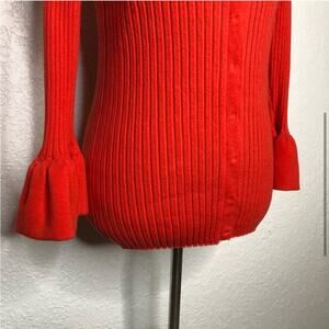Cabi bright orange trumpet sleeve ribbed snap front cardigan.  Round neckline with full snap button front.  Midlength sleeves.  Trumpet flared sleeve cuffs.  Ribbed knit.  Size Small.  Very good preowned condition.  Minor wash wear.  One tiny spot on side and tiny fray on sleeve cuff.  #5285