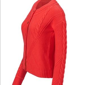 Darling sweater! This cardigan stands out with angled cabling and a bold orange hue. Has a striped grosgrain lining the inside placket.