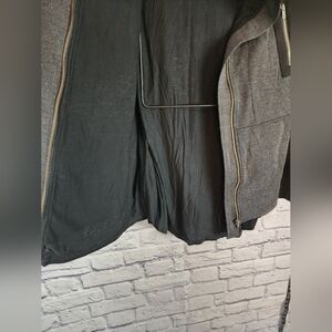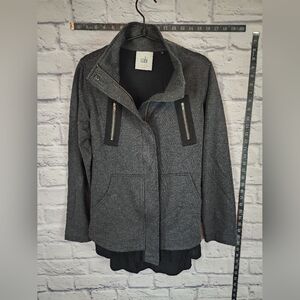 This Cabi jacket stands out with its stylish modern details and functional design. It features a sleek structured design with a high collar and zippered front for a polished look. The layered effect created by the inner black lining and extended hem adds dimension and movement to the overall look. Two zippered chest pockets with contrast panels add a chic, utilitarian touch. The back features a unique open mesh inset, adding breathability and a modern edge and making it a great choice for transitional weather or casual chic ensembles.
