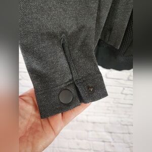 Crafted from a blend of rayon, nylon, and spandex, the fabric provides both comfort and durability. The jacket’s charcoal gray hue and texture exude sophistication, while the soft lining ensures comfort. This jacket is perfect for layering, offering both style and practicality and making it easy to pair with various outfits, whether for casual or semi-formal occasions. This piece is ideal for adding a contemporary edge to your wardrobe.