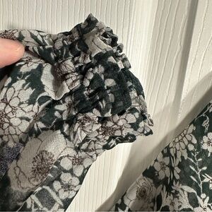 Beautiful green floral peasant blouse from Cabi. Size XS (but very generously proportioned - see measurements). Sheer, double layered, with long sleeves ending in elastic cuffs. V-neck with ruffle detail. Loose fit, flowy.