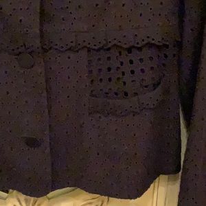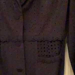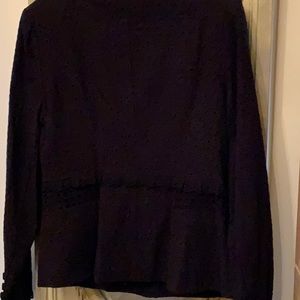 Black Cabi jacket. Lined. Lovely details throughout with buttons along lower sleeves and delicate ruffles. Two small front pockets. Worn once to job interview. In excellent condition
