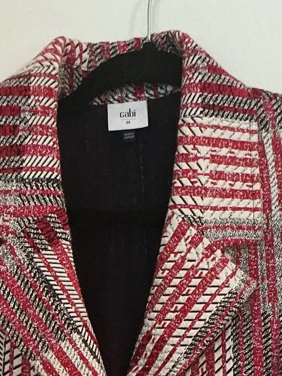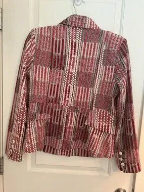Cabi 1. size Medium Patchwork red, white and blue tailored blazer with bold woven pattern. Notched lapel and structured shoulders.