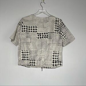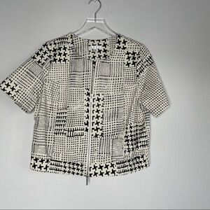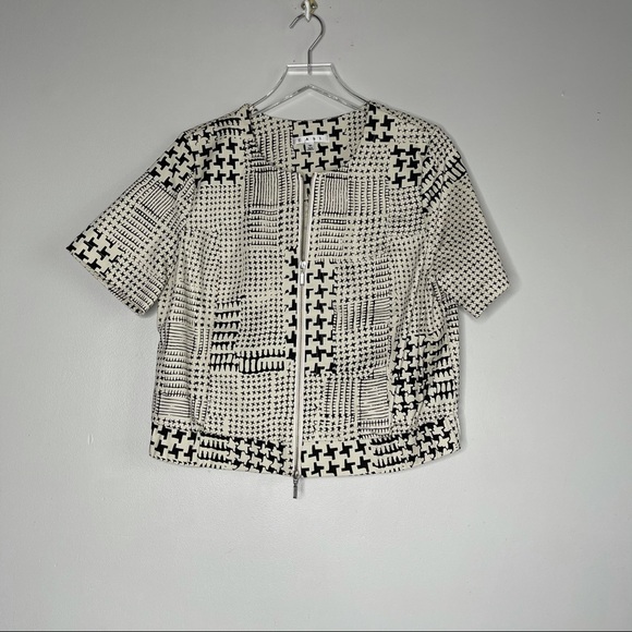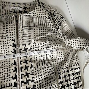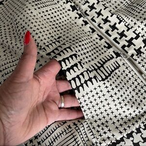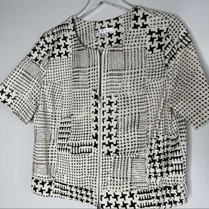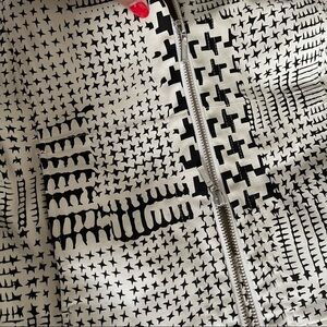 Tan and black zipper both ways. Elastic waist short sleeves. EUC.