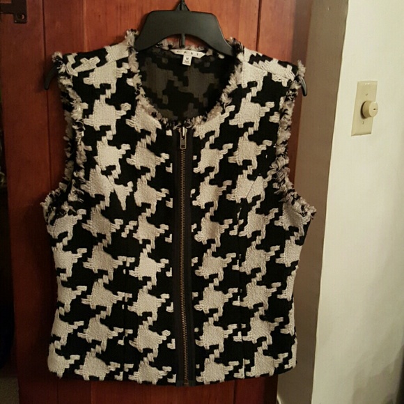Sz medium, hounds tooth, frayed edges, zip front, thin lining, polyester acrylic wool blend, dry clean. Item # 213