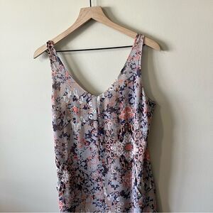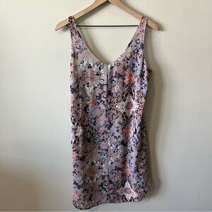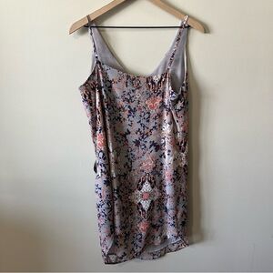CAbi Dress Women's Fresco Slip Dress Front Pockets Adjustable Straps Pullover style with v neckline. V back. Spaghetti straps in back. Double side pockets. Curved side slit hemline. Fully lined. Light pastel purple with deep purple, pink, white abstract print. Style #5049. 100% polyester. Machine wash.