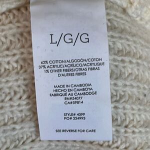 This sweater is made by Cabi. It’s a cream longer length cardigan with 6 buttons. Size large and in very nice pre owned condition. Smoke and pet free home.
