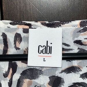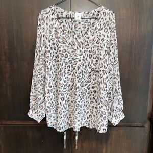 This top is made by Cabi. It’s a white animal print long sleeve blouse. Size large and in very nice pre owned condition. Smoke and pet free home.