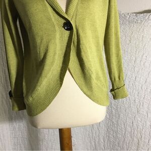 Green Avocado Sweater Hoodie Knit Shrug Linen Blend Cardigan. Style #282. Size and material tags are not available. Best guess it's a size small. Pre-owned in good condition.