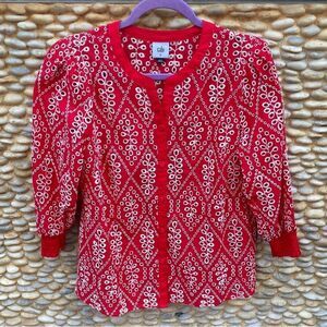 Cabi Red & White Eyelet Lyric Top/Blouse. Size Medium. Excellent Pre-Owned Condition - Worn Once. This is a beautiful must-have haute red top that features three-quarter-length sleeves, a button-front design, and white embroidery adorning a gorgeous crimson hue. Has an easy fit, with solid red banding at the neck and cuffs, has elastic shirring at the cuffs and hits at the high hip. Made of a cotton eyelet fabric. Fabric is 100% Cotton. Ships from a smoke and pet free home.