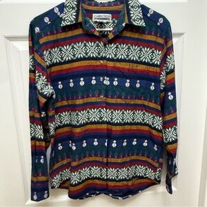Vibrant button-down shirt with festive patterns. Features snowflakes and stripes. Perfect for casual occasions.
