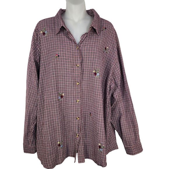 Cabin Creek Shirt Size 22W Long Sleeve Button Plaid Cotton Embroidered Flowers