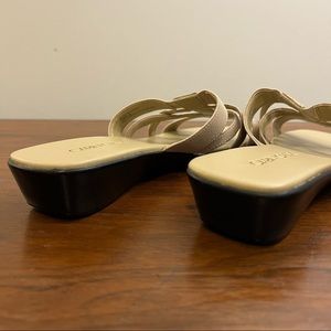 Excellent condition! Crisscross straps and easy slide on beige sandals. Approximate heal height is 1.5”.