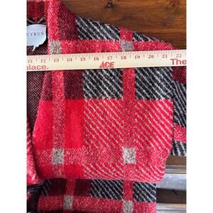 Rustic CabinCore red plaid wool blend cardigan sweater by Cyrus in a classic cozy design. This medium-weight knit has a soft handfeel with just enough wool for warmth, featuring a bold red and neutral plaid pattern that fits perfectly into cabin-inspired, lodge, and rustic-chic wardrobes. The open-front silhouette with button closure layers easily over tees or flannels, making it versatile for fall and winter styling. Great with denim, leggings, or skirts for casual weekends, holiday gatherings, or ski lounging.