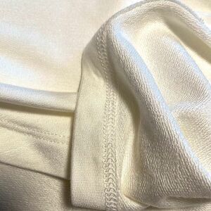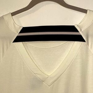 Cabi top with open back detail in cream color with raglan long sleeve tunic size M. Super soft French terry fabric. Back has a dark piece of trim that goes across a V-shaped opening. See photos.