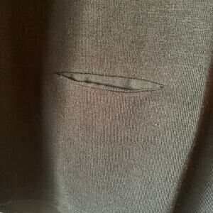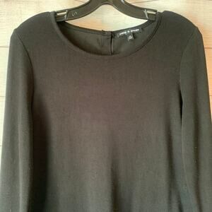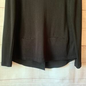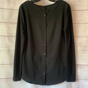Black long-sleeve blouse by Cable & Gauge. This shirt has a soft cottony front and sleeves and then a silky button-up back. It has a round neckline and two slit pockets on the bottom of the front. The back is slightly longer than the front. Is is pre-owned but in great condition.