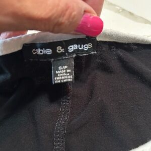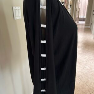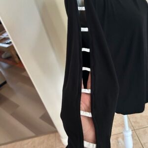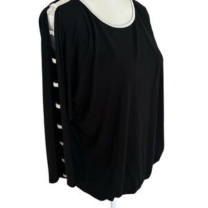 Chic black top with white cut out accents on the sleeves. Ideal for a stylish look. Size S