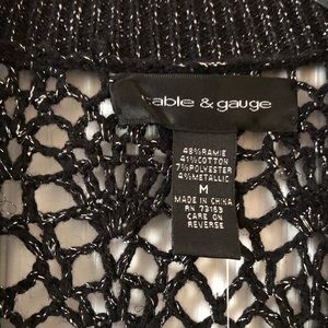 Cable & Gauge Black/Silver Metallic Thread Open Crocheted Evening Jacket, Size M, New with tags. The fabric consists of 48% ramie, 41% cotton, 7% polyester and 4% metallic. Hand wash warm, lay flat to dry. It measures approximately 24” long with an open front.