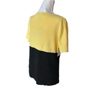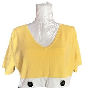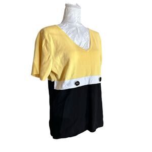 This Cable Gauge short sleeve top is new with tags and perfect for a polished yet casual look. Features a yellow, white, and black colorblock design with a V-neck and decorative buttons at the waist. The soft, stretchy fabric gives it a flattering fit for everyday wear or work outfits.