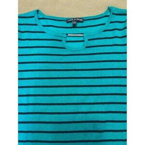 Add a pop of color to your wardrobe with this vibrant green Cable & Gauge sweater! Features black horizontal stripes, 3/4 length sleeves, and a unique cutout detail at the neckline. Soft, lightweight knit perfect for layering or wearing on its own. Rayon/Nylon - Size L - EUC