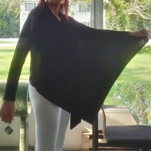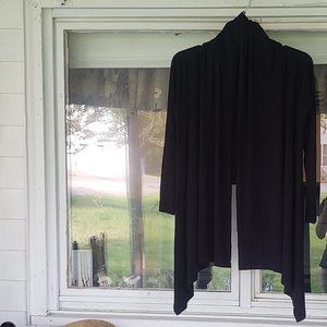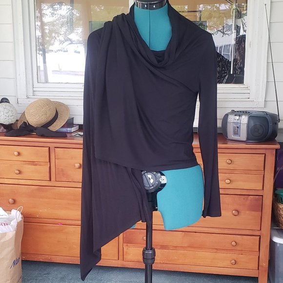 Cable & Gauge hi-low cardigan wrap. This unique long sleeve, black sweater is versatile and can be worn several ways. The 2 sides are longer than the back so you can wrap around the shoulder or tie in front or side - even tie into a shrug. 95% viscose, 5% spandex. Size S. Worn once.