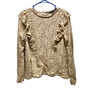 Cable & Gauge Women's Medium Tan Lace Blouse Sheer Sleeves Ruffled Front Boho
