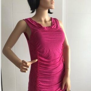Deep Pink shirred top with stretch lace at sides. Pullover sleeveless style has slight scoop neckline with flattering/slimming shirring at both sides. Size Small. Shirt is 100 percent viscose, lace is 93 percent nylon/7 percent spandex