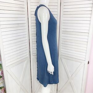 Steel chambray denim look blue, Crisscross faux lace up back, Lightweight jersey knit fabric, Round neck, Sleeveless, Knee length, Pullover