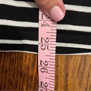 This is a ladies Cable & Gauge short sleeve tee. It is black with white stripes. The sleeves are adorned with little buttons. The shirt is 97% viscose and is super lightweight, a size XL.